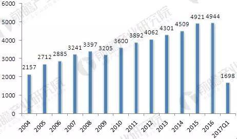 2004-2017年全球鋁材產(chǎn)量(單位:萬噸)
